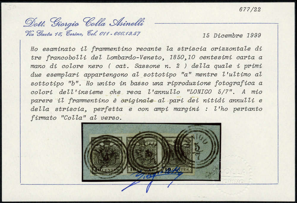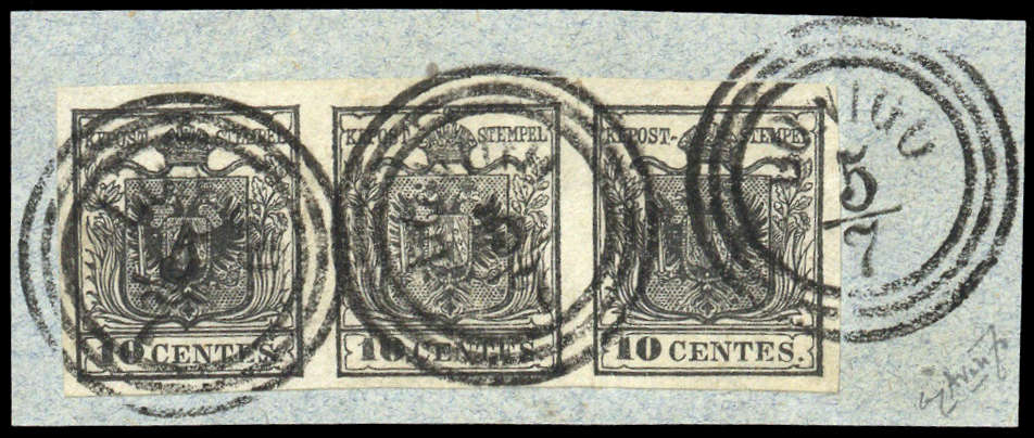 | Zusatzinformationen und Suchstichworte: | DBA Freiburg GmbH Los 1671400504 Österreich Lombardei Venetien 1850, 10 C. Wappen, voll-breitrandiger waagerechter Dreierstreifen auf Briefstück mit 3 x K3 "Lonigo 5/7", Atteste Dr. Giulio Bolaffi und Dott. Giorgio Colla Festpreis 600,00 EUR |
