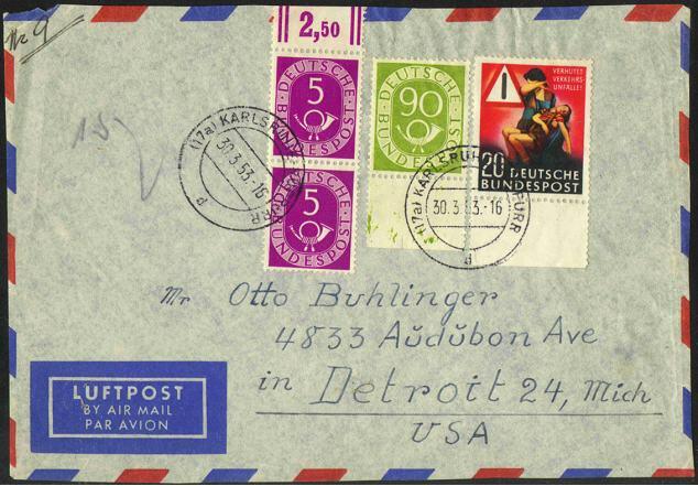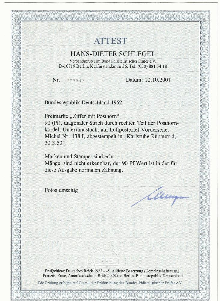 | Zusatzinformationen und Suchstichworte: | Klaus Straßberger Briefmarkenspezialversand Los 0000102493 Bundesrepublik Deutschland 90Pfg Posthorn mit der Abart 138 I "diagonaler Strich durch die Kordel" vom Unterrand, auf Briefvorderseite. Im Michel keine Briefbewertung. Nur wenige Briefe bekannt. Attest Schlegel. Festpreis 1.200,00 EUR |