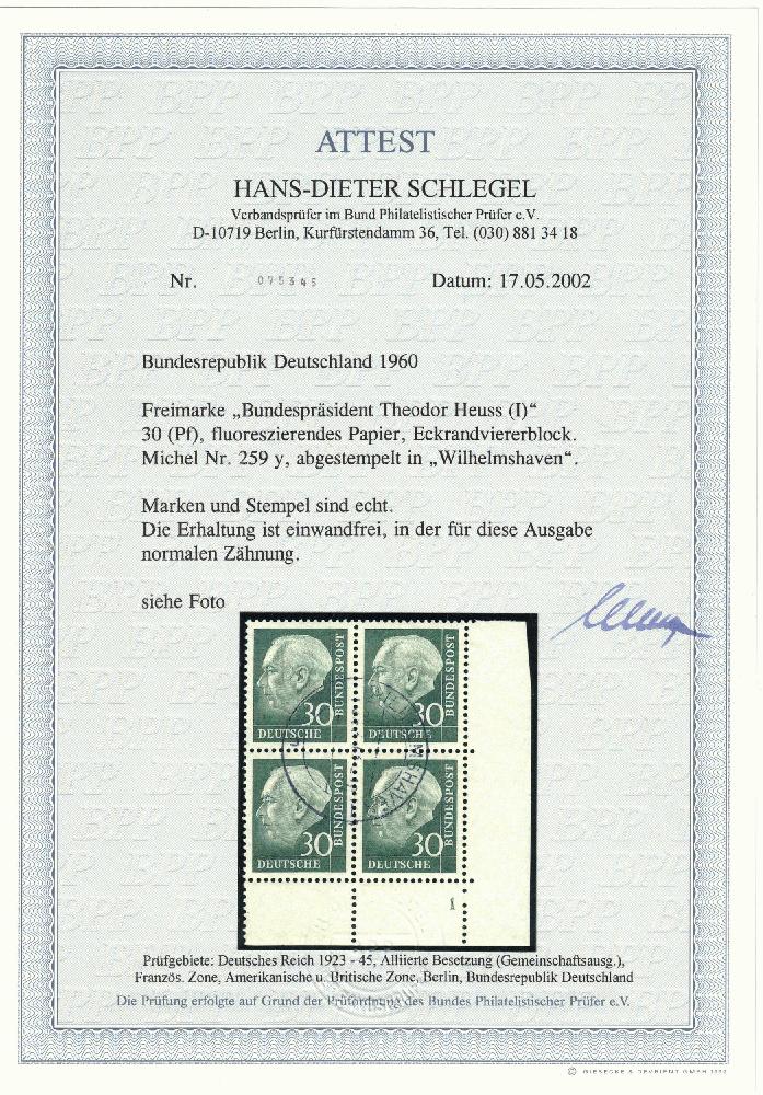 | Zusatzinformationen und Suchstichworte: | Klaus Straßberger Briefmarkenspezialversand Los 0000102762 Bundesrepublik Deutschland 30Pfg Heuss II, 259y (Lumogen) im Eckrand-Vierer mit Formnummer 1 gestempelt. Foto-Attest Schlegel. Festpreis 500,00 EUR |