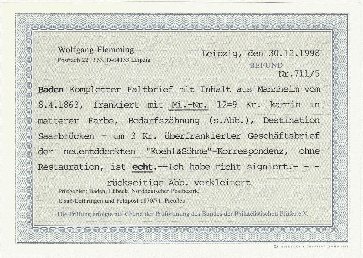 | Zusatzinformationen und Suchstichworte: | Klaus Straßberger Briefmarkenspezialversand Los 0000106762 Altdeutschland Baden Baden 12 auf Brief auf Brief von Mannheim nach Saarbrücken. Befund Flemming. Festpreis 195,00 EUR |