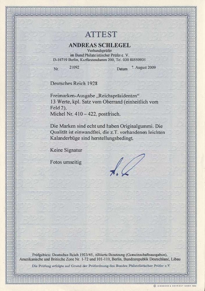 | Zusatzinformationen und Suchstichworte: | Uwe von Poblocki Los 0948701626 Deutsches Reich, 1923/32 Weimarer Republik 1928, 3-80 Pfg. Präsidenten Ebert/Hindenburg mit Oberrand, kompletter postfrischer Satz einheitlich vom Plattendruck in Luxusqualität ohne Signaturen mit Fotoattesten A.Schlegel BPP, einheitlich vom Feld 2 aus Viererblocktrennung (außer 15 Pfg., diese ist im Attest noch als W-Druck enthalten und zugunsten der Einheitlichkeit des Satzes ausgetauscht!), daher auch die Ränder einwandfrei ungefaltet und ungefalzt! Michel-Wert ca. 2.800,- Festpreis 750,00 EUR |