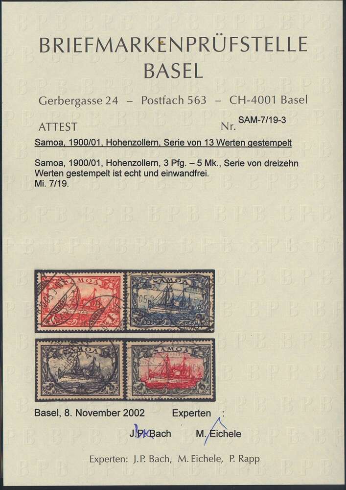 | Zusatzinformationen und Suchstichworte: | Uwe von Poblocki Los 0948702630 Deutsche Kolonien Samoa 1901, 3 Pf. - 5 M. Kaiseryacht "Hohenzollern" ohne Wz., einwandfreier, sauber gestempelter kompl. Satz, Höchstwert signiert Ebel & Richter, Attest BPSB, Mi€ 1.000,- Festpreis 450,00 EUR |