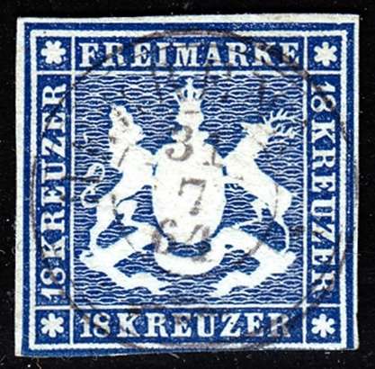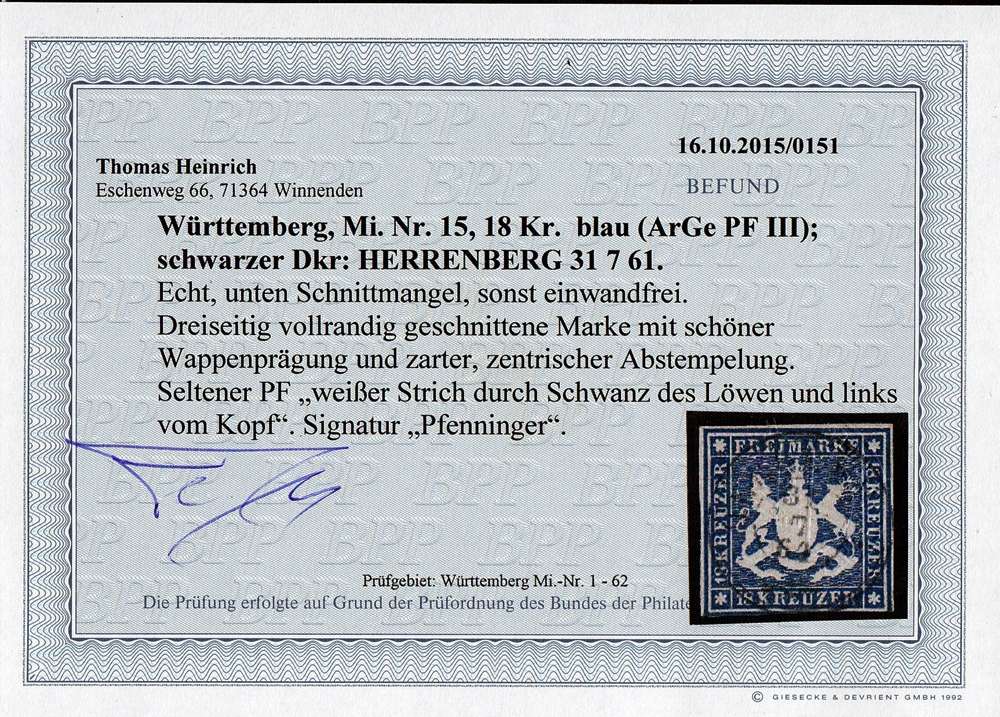 | Zusatzinformationen und Suchstichworte: | Uwe von Poblocki Los 0948701131 Altdeutschland Württemberg 1859, 18 Kr. blau, dreiseitig voll-breitrandiges und sehr frisches Prachtstück mit sehr schön erhaltener Wappenprägung, die Marke weist den Plattenfehler "weißer Strich durch Schwanz des Löwen und links vom Kopf" auf, zentrisch klarer DKr "HERRENBERG 31.7.61", attraktives Exemplar , sign. Pfenninger sowie Befund Heinrich BPP "einwandfrei...unten Schnittmangel", Mi€ 3.000,-+ Festpreis 550,00 EUR |