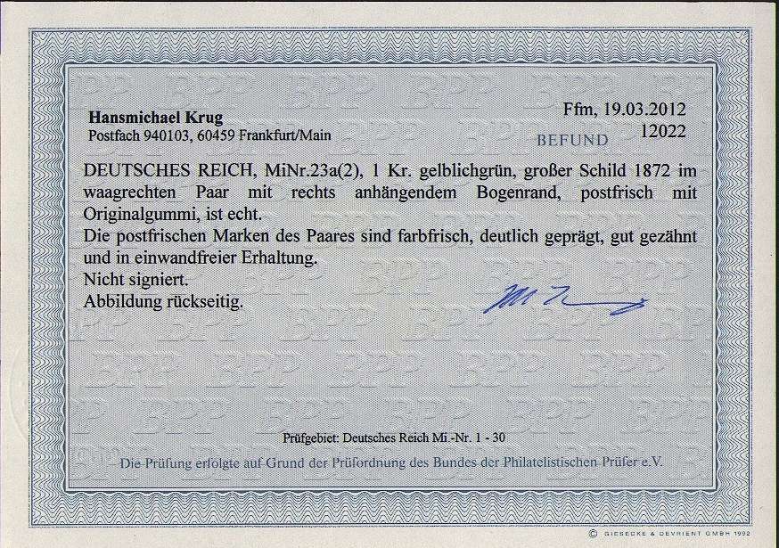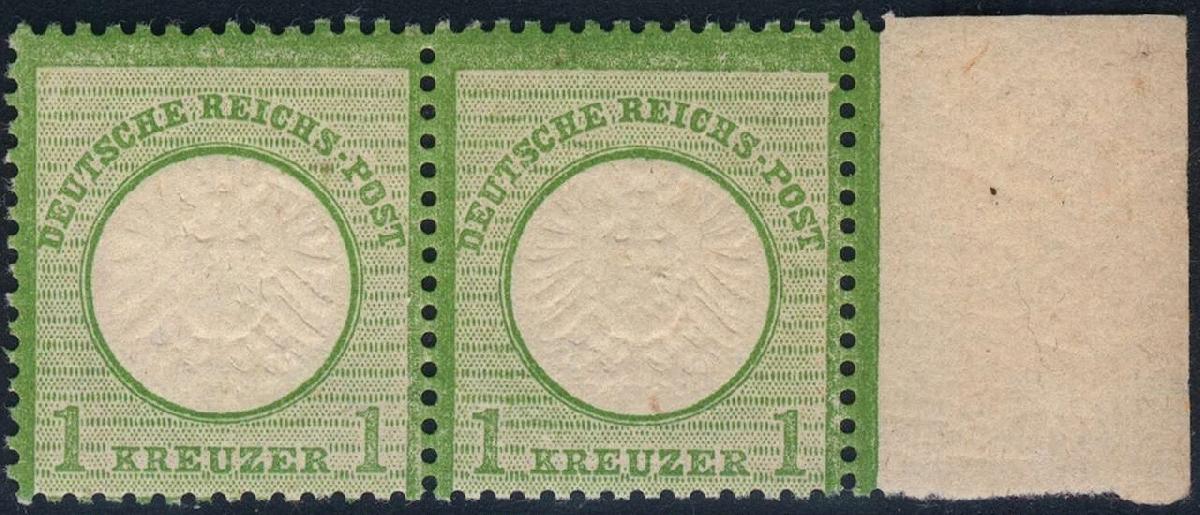 | Zusatzinformationen und Suchstichworte: | Uwe von Poblocki Los 0948701602 Deutsches Reich, 1872 Grosser Brustschild 1872, 1 Kreuzer gelbgrün, Adler mit großem Brustschild, einwandfrei postfrisches waagerechtes Paar vom rechten Bogenrand, farbfrisch und gut geprägt, ohne Signaturen(!) mit Befund Krug BPP "echt und einwandfrei" (Mi€ ca. 450.-) Festpreis 220,00 EUR |