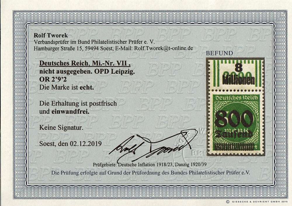| Zusatzinformationen und Suchstichworte: | Uwe von Poblocki Los 0948701111 Deutsches Reich, 1918/23 Inflationsausgaben 1923, 800 T. auf 300 M. Ziffern OPD Leipzig, postfrisches Oberrandstück dieser nicht verausgabten Marke in der bess. Walzenstrichkonfiguration 2'9'2, ungefaltet und ohne Signaturen(!) mit Befund Tworek BPP, Mi€ 350,- Festpreis 160,00 EUR |