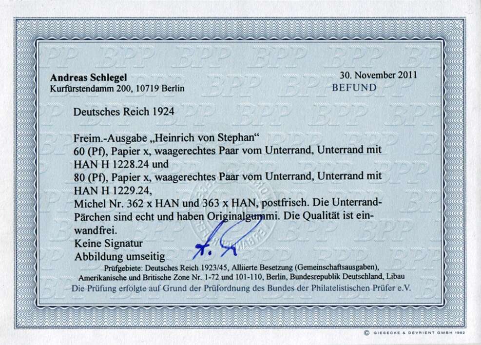 | Zusatzinformationen und Suchstichworte: | Uwe von Poblocki Los 0948702771 Deutsches Reich 1924, Heinr. von Stephan, 60-80 Pfg. kompl. Satz im Unterrandpaar mit vollständiger HAN "H 1228 bzw. 1229.24", einwandfrei postfrisch und ungefaltet, ohne Signaturen mit Befund A.Schlegel BPP Festpreis 250,00 EUR |