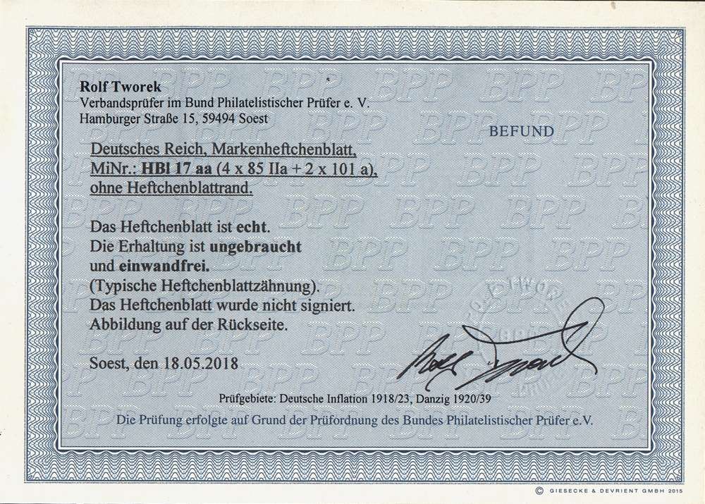 | Zusatzinformationen und Suchstichworte: | Uwe von Poblocki Los 0948701740 Deutsches Reich, Germania mit WZ 1917/18, 15 u. 5 Pfg. Germania, senkrechter und waagerechter ZDr noch im Heftchenblatt, postfrisch und ungefaltet mit guter Heftchenzähnung aus dem MH 9 in einwandfreier Qualität, unsigniert mit Befund Tworek für Heftchenblatt o.Rd. (mittig oben mit Falz) (Mi€ 600,-) Festpreis 140,00 EUR |