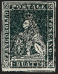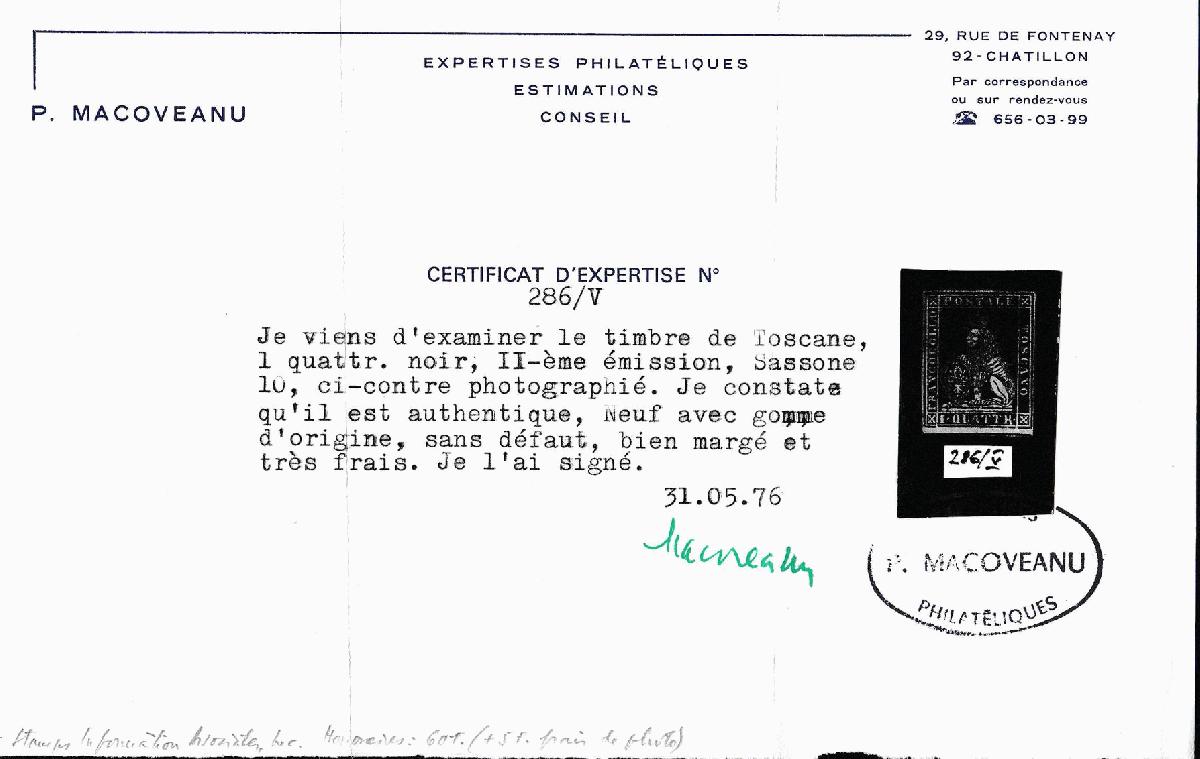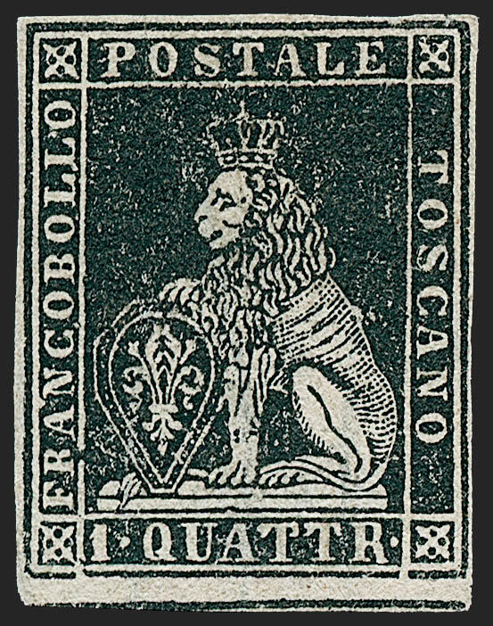 | Zusatzinformationen und Suchstichworte: | Robert A. Siegel - Worldwide Stamps and Postal History Auktionstermin: 21. - 23. Juni 2022 Los 4306 Italien Staaten Toscana Italienische Staaten, Toskana, 1857,1q schwarz (10; Sassone 10). Originalgummi, kleiner Falz, große Seitenrand unten, reichlich auf sonstige Seiten, intensive Nuance und Prägung, Pracht, mit 1976 Macoveanu Attest, Scott $1,750,00, Sassone € 3,500 Ausruf 300,00 USD |