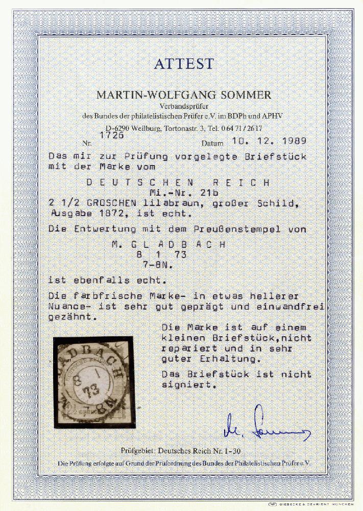 | Zusatzinformationen und Suchstichworte: | Briefmarken Fischer Shop Los 0000415146 Deutsches Reich, 1872 Grosser Brustschild 2 1/2 Gr. lilabraun, herrl. Bfstk. mit zentr. klarem K2 "M. GLADBACH", Attest Sommer "sehr gut geprägt, einwandfrei gezähnt, gute Erhaltung (700,-) Festpreis 200,00 EUR |