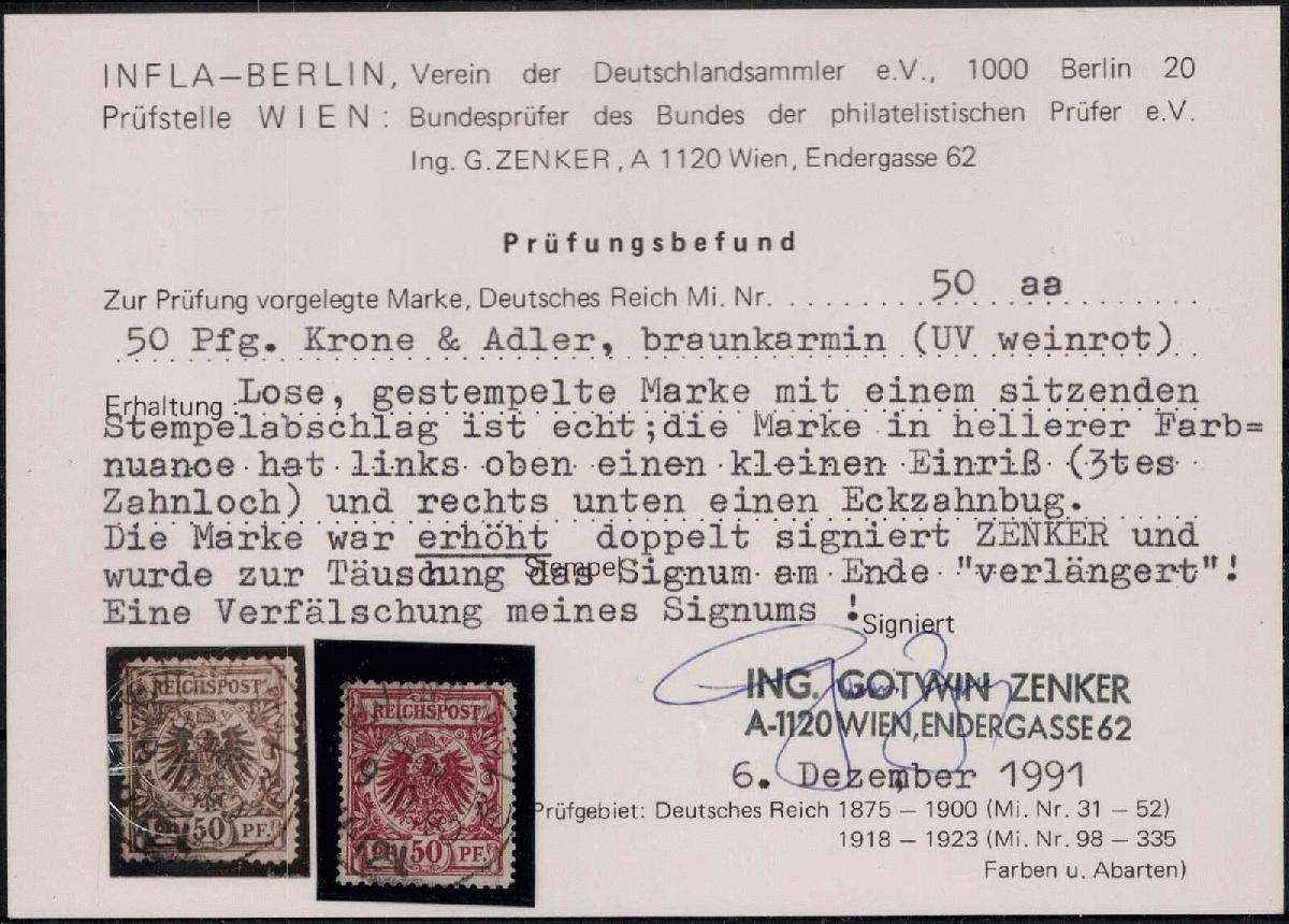 | Zusatzinformationen und Suchstichworte: | Briefmarken Fischer Shop Los 0000418170 Deutsches Reich, 1889 Krone/Adler50 Pf. Krone-Adler in seltener aa-Farbe sauber rundgestempelt, kl. Mgl. siehe Befund Zenker (2000,-) Festpreis 250,00 EUR |
