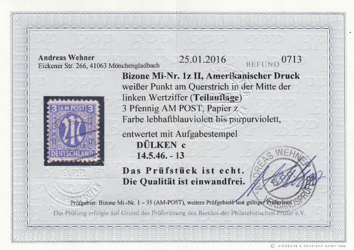 | Prüfer: | Wehner, Andreas (BPP (Bund Philatelistischer Prüfer)) |