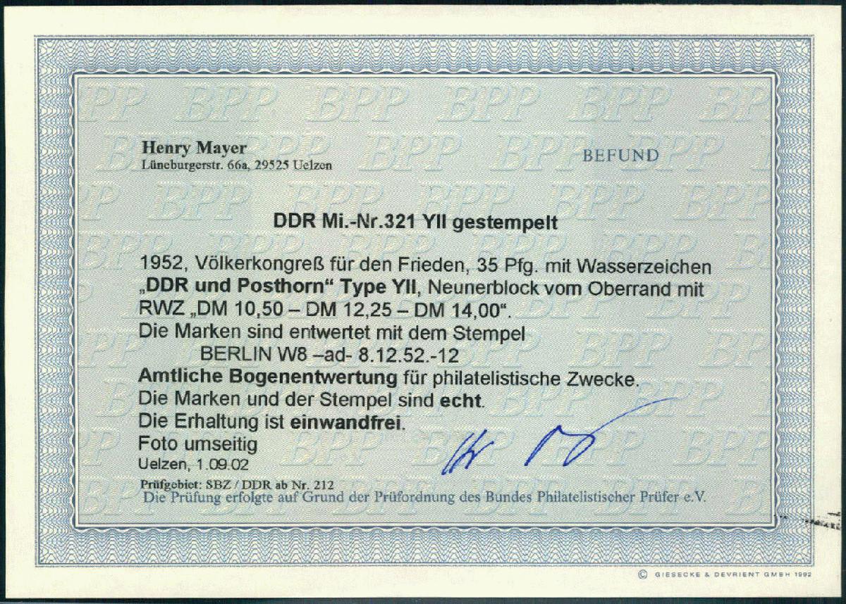 | Zusatzinformationen und Suchstichworte: | Briefmarken Fischer Shop Los 0000412276 DDR Völkerkongreß für den Frieden 1952 im gestempeltem 9er.-Block , Befund Mayer "echt, einwandfrei" (375,-) Festpreis 60,00 EUR |
