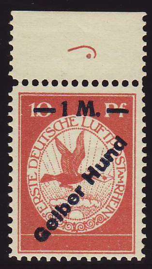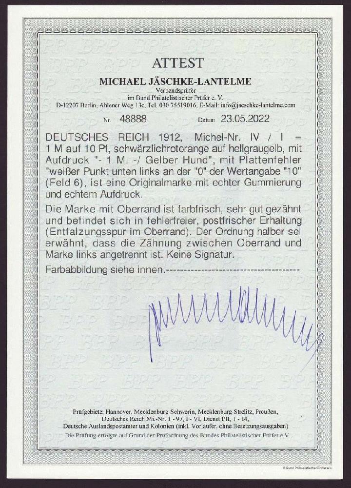 | Zusatzinformationen und Suchstichworte: | Christian E. Geigle Briefmarkenfachhandel Los 0004046798 Deutsches Reich 1912, Gelber Hund, 1 M auf 10 Pf. schwärzlichrotorange auf hellgraugelb mit Aufdruck "- 1 M - Gelber Hund" in Dunkelblau, postfrisches, sehr gut gezähntes Luxusstück mit dem Plattenfehler "weißer Punkt unten links an der 0 der Wertangabe 10" (Bogenfeld 6), sehr seltene Marke, unsigniert mit FA Jäschke-Lantelme "fehlerfrei". Festpreis 1.750,00 EUR |