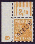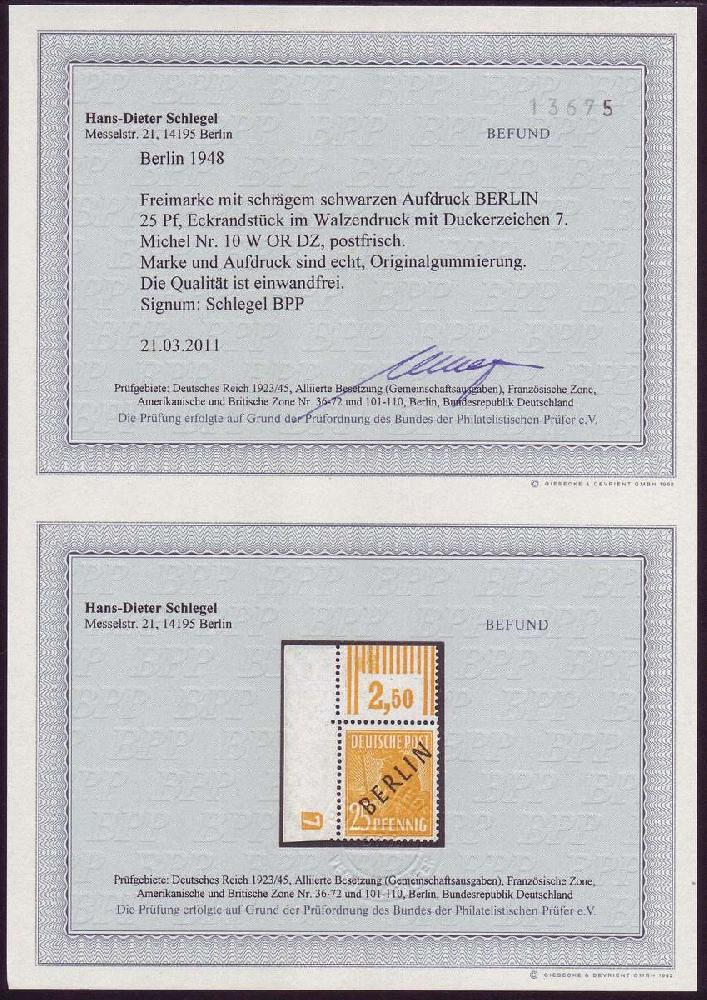 | Zusatzinformationen und Suchstichworte: | Christian E. Geigle Briefmarkenfachhandel Los 0001820269 Berlin 1948, Schwarzaufdruck, 25 Pf. lebhaftgelblichorange, postfrische Kabinettbogenecke links oben mit Druckerzeichen "7" (negativ), auch die Bogenränder tadellos postfrisch (minimale Eckstauchung wird im Befund nicht bemängelt, da für das DZ nicht relevant), sehr selten, FB Schlegel "einwandfrei". Festpreis 2950,00 EUR |