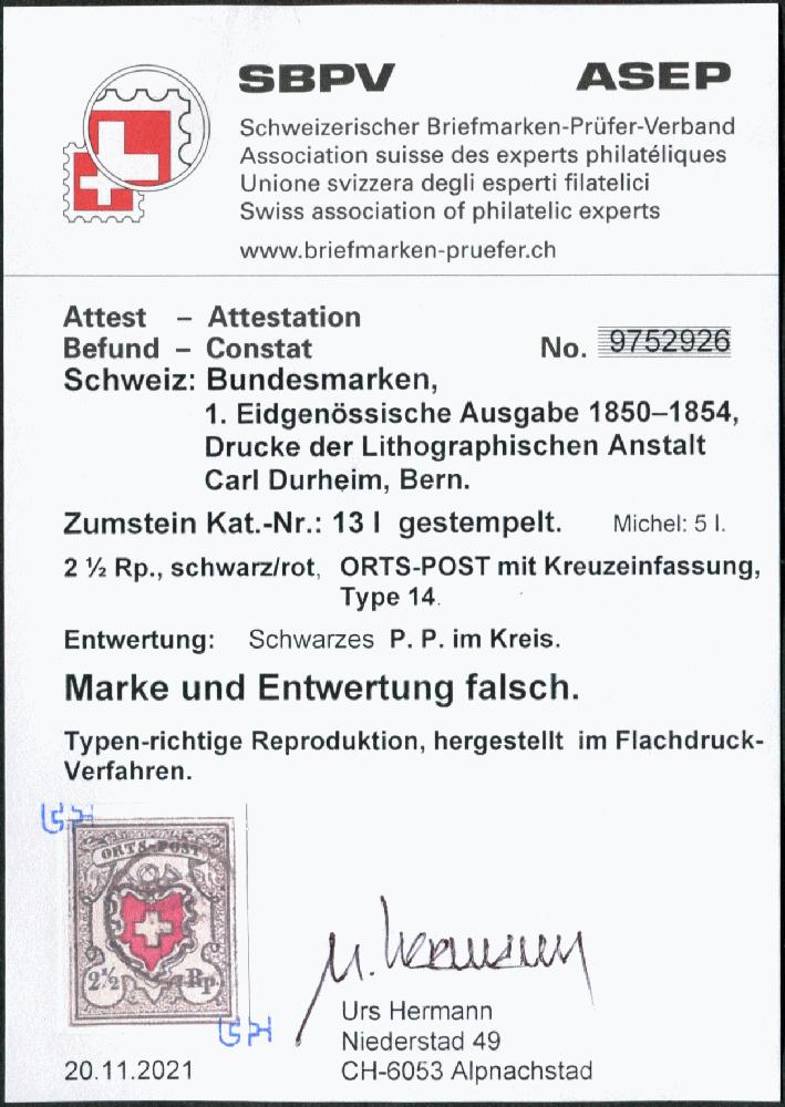 | Prüfer: | Hermann, Urs (SBPV / ASEP (Schweizerischer Briefmarken-Prüfer-Verband)) |