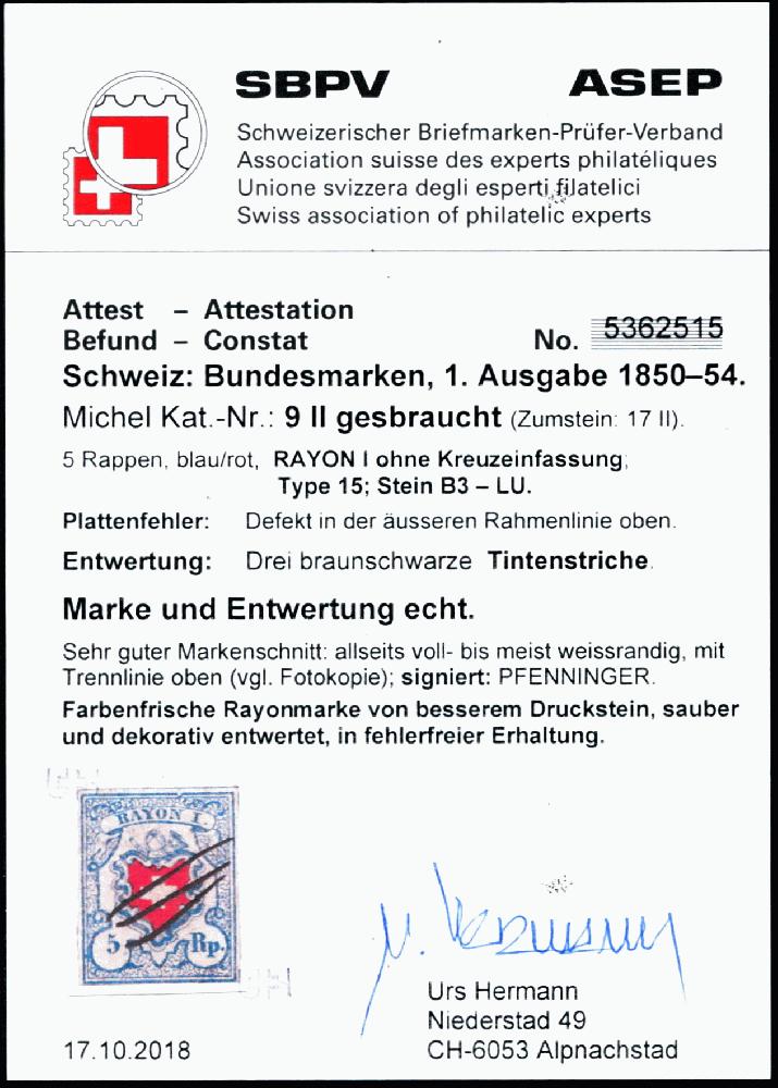 | Zusatzinformationen und Suchstichworte: | 108. Briefmarken Lenz Auktion Auktionstermin: 29. April - 5. Mai 2022 Los 2029 Schweiz 5 Rp. Rayon I, Type 15, Druckstein B3-LU, voll- weissrandig, PF "Defekt in der äusseren Rahmenlinie oben", Entwertung durch 3 braunschwarze Tintenstriche, farbfrische und fehlerfreie Erhaltung, siehe Befund/Attest Hermann 2020 Ausruf 100,00 EUR |