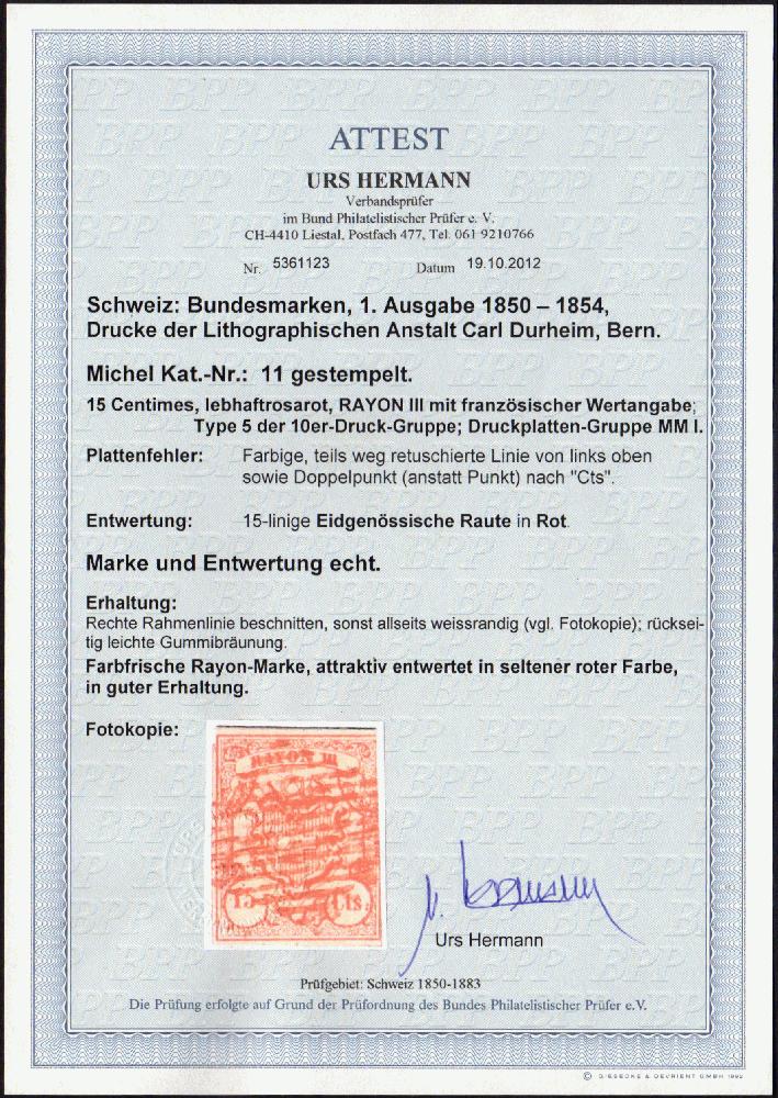 | Zusatzinformationen und Suchstichworte: | 108. Briefmarken Lenz Auktion Auktionstermin: 29. April - 5. Mai 2022 Los 2041 Schweiz 15 Cts. Rayon III, Type 5, Druckstein MM I, rechts angeschnitten, sonst allseits weissrandig, rückseitig leichte Gummibräunung, PF: "Farbige, teils weg retuschierte Linie von links oben sowie Doppelpunkt nach Cts.", gest. 15 linige Raute in rot, farbfrische Marke attraktiv entwertet in seltener roter Farbe, in guter Erhaltung, siehe Attest Hermann 2012 Ausruf 250,00 EUR |