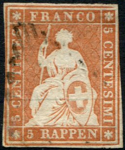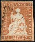 | Zusatzinformationen und Suchstichworte: | 108. Briefmarken Lenz Auktion Auktionstermin: 29. April - 5. Mai 2022 Los 2057 Schweiz 1854, 5 Rp. braunorange, Erstauflage mit grünem Seidenfaden, Klischeefehler "Randlinie links unten gespalten", rechte Randlinie oben kurz beschnitten, sonst voll- meist weissrandig, feines Relief, bügig im oberen Schrifrahmen, soweit fehlerfrei, gest. schwarze Raute, Farbfrische Marke der seltenen 1. Münchener Auflage, zart entwertet, in guter Erhaltung, Attest/Befund Hermann 2016, Mi.1500,-+ Ausruf 300,00 EUR |