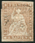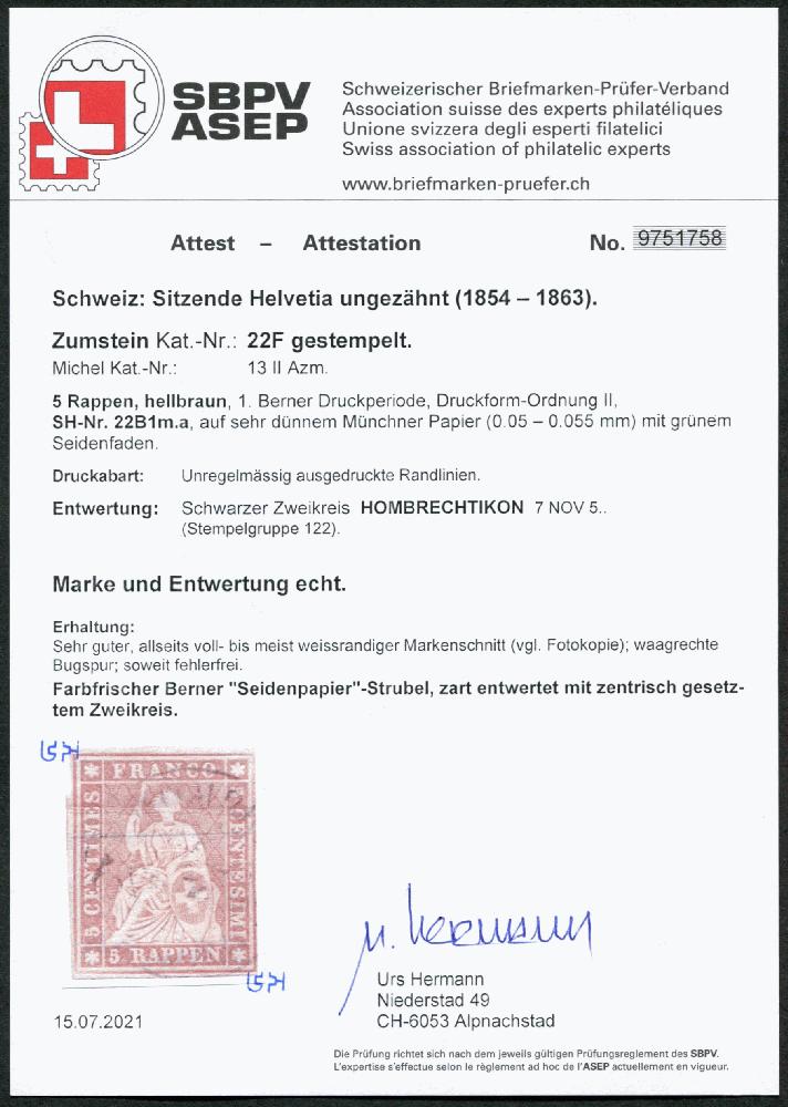 | Zusatzinformationen und Suchstichworte: | 108. Briefmarken Lenz Auktion Auktionstermin: 29. April - 5. Mai 2022 Los 2071 Schweiz 1855, 5 Rp. Strubel, vollrandige Marke mit schwarzem K2 "Hombrechtikon 7 NOV 5..", waagrechter Bug, farbfrischer Seidenpapier Strubel, Echt, Attest Hermann, Mi.1.000,- Zuschlag 144,00 EUR |