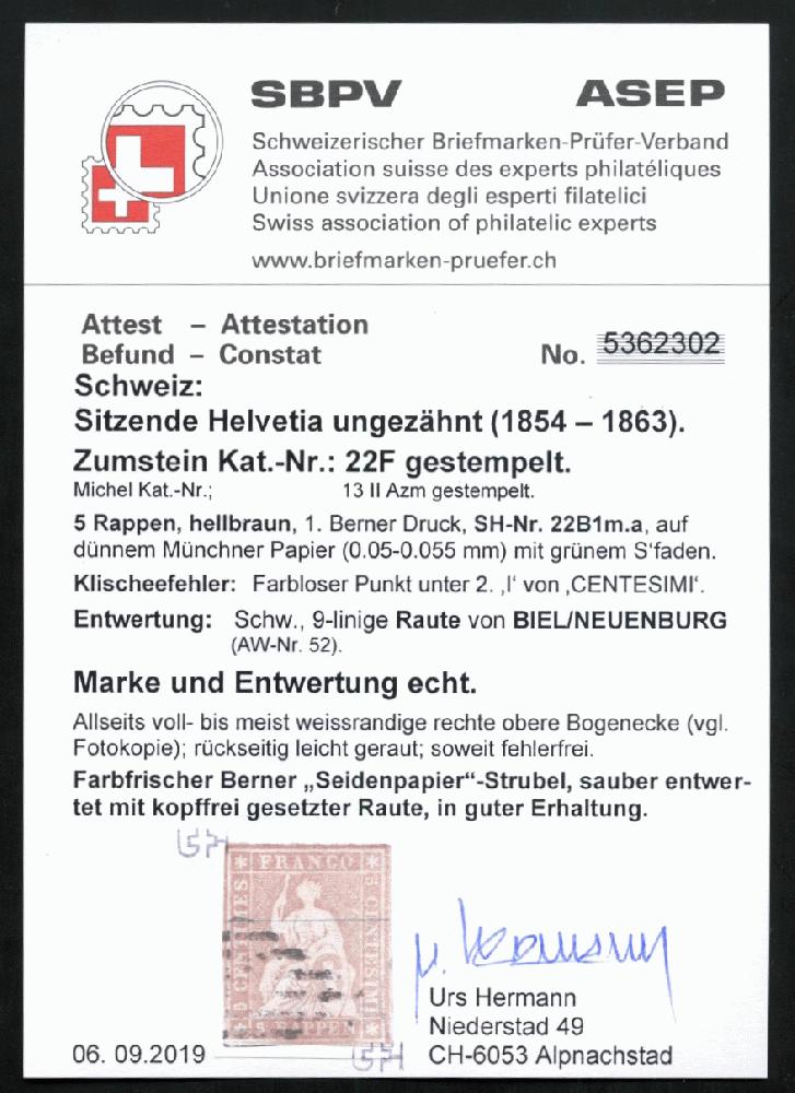 | Prüfer: | Hermann, Urs (SBPV / ASEP (Schweizerischer Briefmarken-Prüfer-Verband)) |