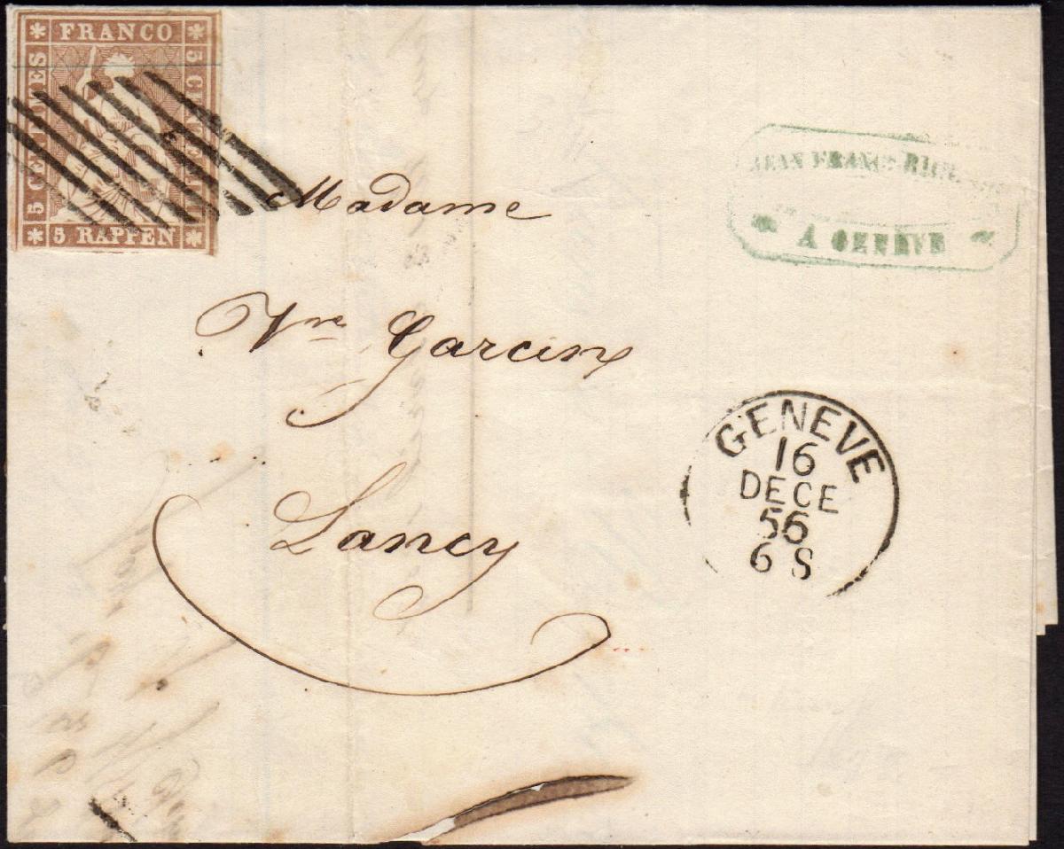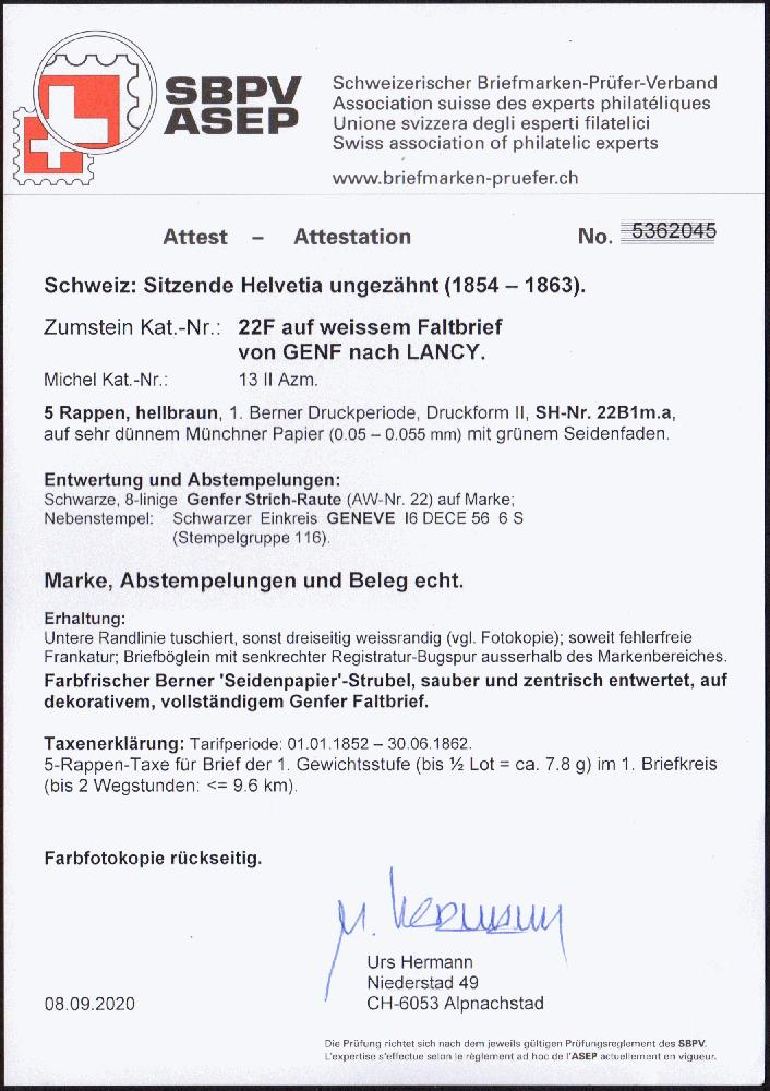 | Zusatzinformationen und Suchstichworte: | 108. Briefmarken Lenz Auktion Auktionstermin: 29. April - 5. Mai 2022 Los 2076 Schweiz 1854, 5 Rp. hellbraun, 1. Berner Druckperiode (SH-Nr. 22B1m.a), Randlinie unten tuschiert, dreiseitig weissrdg., gest. schwarze Raute, Nebenstpl. schwarzer EK "GENEVE 16 DECE 56 6" nach Lancy, farbfrischer Berner "Seidenpapier"- Strubel, sauber und zentrisch entwertet, auf dekorativem, vollständigem Genfer Faltbrief, siehe Attest Hermann 2020 Ausruf 500,00 EUR |
