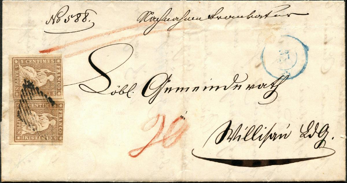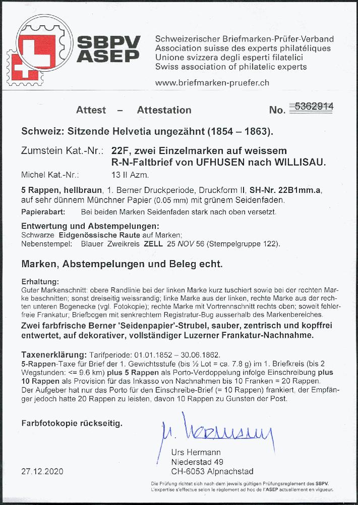 | Zusatzinformationen und Suchstichworte: | 108. Briefmarken Lenz Auktion Auktionstermin: 29. April - 5. Mai 2022 Los 2077 Schweiz 1854, 2x 5 Rp. hellbraun, 1. Berner Druckperiode (SH-Nr. 22B1mm.a), 2 Einzelmarken auf weissem R-N-Faltbrief von UFHUSEN nach WILLISAU. Guter Markenschnitt: obere Randlinie bei der linken Marke kurz tuschiert sowie bei der rechten Marke beschnitten, sonst dreiseitig weissrdg., linke Marke aus der linken, rechte aus der rechten unteren Bogenecke., rechte Marke mit Vortrennschnitt, soweit fehlerfreie Frankatur, gest. schwarze Eidgen. Raute auf Marken, Nebenstpl. blauer Zweikreis "ZELL 25 NOV 56", farbfrischer Berner "Seidenpapier"- Strubel, sauber, zentrisch und kopffrei entwertet, auf dekorativem, vollständiger Luzerner Frankatur-Nachnahme., siehe Attest Hermann 2020 Ausruf 1.000,00 EUR |