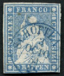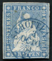 | Zusatzinformationen und Suchstichworte: | 108. Briefmarken Lenz Auktion Auktionstermin: 29. April - 5. Mai 2022 Los 2093 Schweiz 1854, 10 Rp. preussischblau der 3. Druckperiode (SH-Nr. 23A3.c), untere Randlinie rechts tuschiert, sonst allseits voll- weissrdg., sehr klar gest. blauer Fingerhut "SCHÖFTLAND 3 OCTO 54", farbfrisch, in guter Erhaltung, Attest/befund Hermann 2018 Zuschlag 155,00 EUR |
