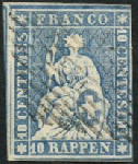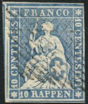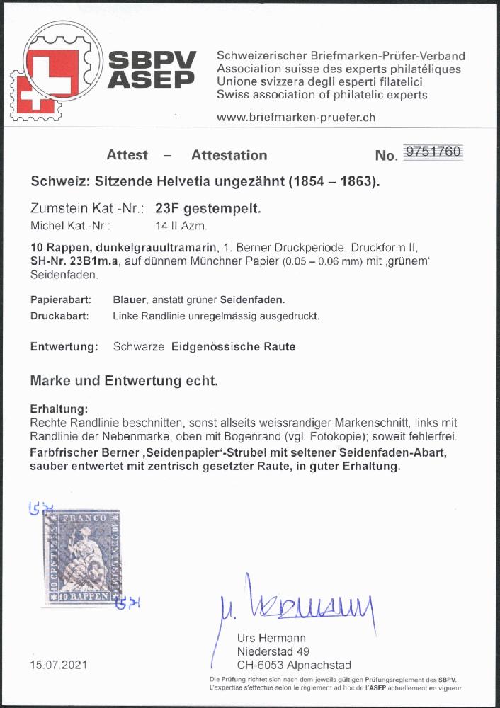 | Zusatzinformationen und Suchstichworte: | 108. Briefmarken Lenz Auktion Auktionstermin: 29. April - 5. Mai 2022 Los 2102 Schweiz 1855, 10 Rp. Münchner Druck, rechts beschnitten, sonst weissrandig, mit schwarzer Raute, blauer statt grüner Seidenfaden, Echt und in guter Erhaltung, Attest Hermann, Mi.900,- Zuschlag 160,00 EUR |