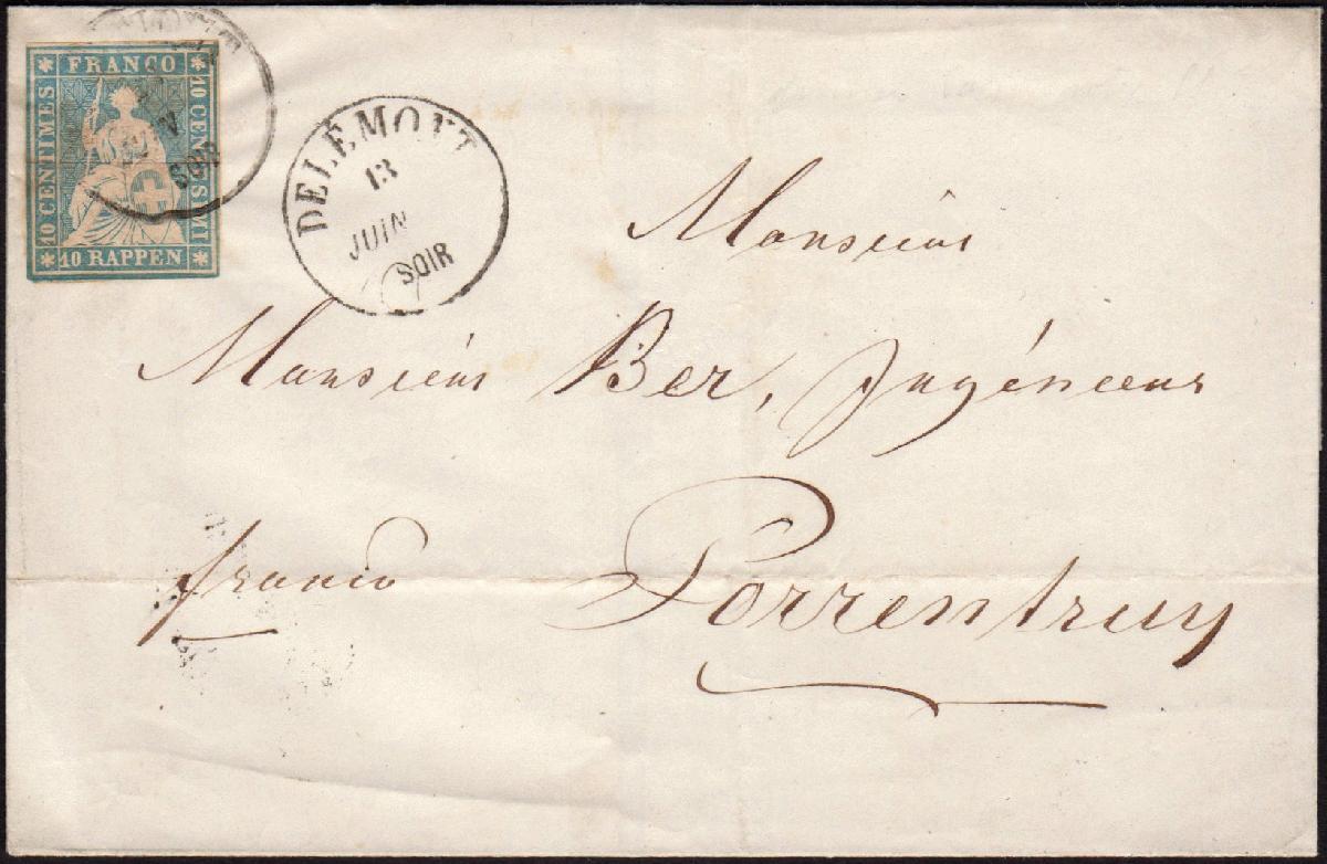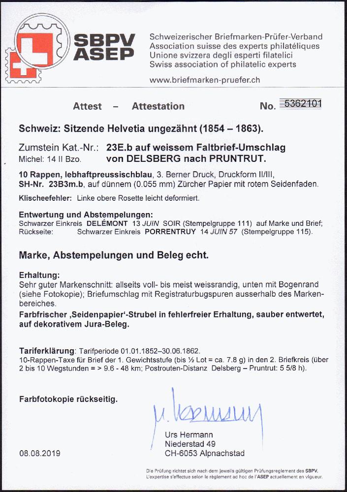 | Zusatzinformationen und Suchstichworte: | 108. Briefmarken Lenz Auktion Auktionstermin: 29. April - 5. Mai 2022 Los 2110 Schweiz 1856, 10 Rp. lebhaftpreussischblau, 3. Berner Druck (SH-Nr. 23B3m.b), Faltbrief-Umschlag von DELSBERG nach PRUNTRUT. Sehr guter Markenschnitt: allseits voll- meist weissrdg, unten mit Bogenrand, Klischeefehler, Entwertung schwarzer EK "DELEMONT 13 JUIN SOIR" auf Marke und Brief", rs. schwarzer EK "PORRENTRUY 14 JUIN 57", farbfrischer Seidenpapier- Strubel in fehlerfreier Erhaltung, sauber entwertet auf dekorativem Jura-Beleg, siehe Attest Hermann 2019 Ausruf 300,00 EUR |