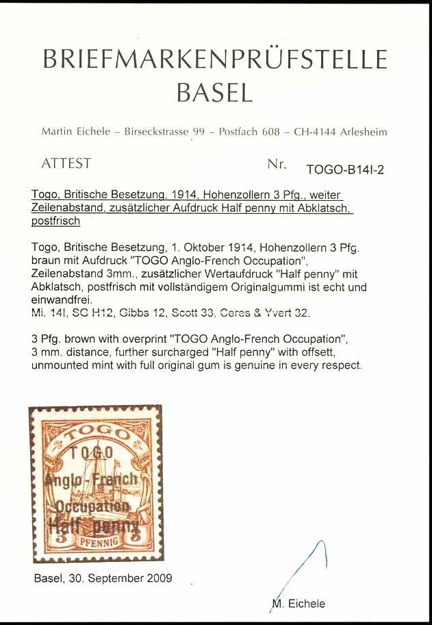 | Prüfgebiet: | Deutsche Kolonien Togo Britische Besetzung |
