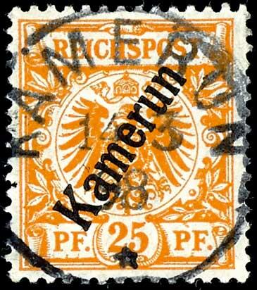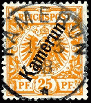 | Zusatzinformationen und Suchstichworte: | Dr. Reinhard Fischer 187. Auktion Auktionstermin: 15. Juli 2022 Los 3412 Deutsche Kolonien Kamerun 25 Pfennig Krone/Adler mit Plattenfehler II (I oben gespalten), sauber gestempelt "KAMERUN", gute Bedarfserhaltung, Befund Steuer BPP, Mi. 300.- Ausruf 90,00 EUR |