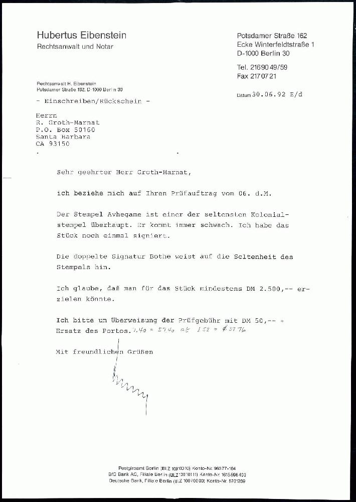 | Zusatzinformationen und Suchstichworte: | Dr. Reinhard Fischer 187. Auktion Auktionstermin: 15. Juli 2022 Los 3717 Deutsche Kolonien Togo AVHEGAME zentral auf 5 Pfennig Kaiseryacht, typischer Abschlag, doppelt geprüft Bothe und Befund Eibenstein vom 30.6.1992 "Der Stempel Avhegame ist einer der seltensten Kolonialstempel überhaupt. Er kommt immer schwach. Ich glaube, dass man für das Stück mindestens DM 2.500.- erzielen könnte" - Vorbesitzer Groth-Marnat USA ARGE 1.500.- Stempel nur 4 Monate in 1912 verwendet. Ausruf 500,00 EUR |