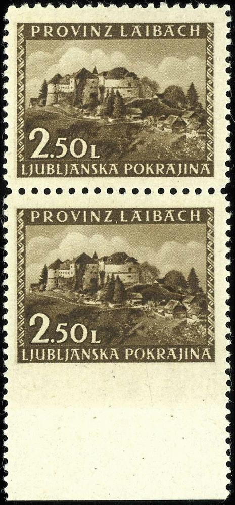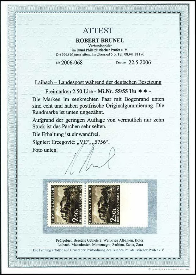 | Zusatzinformationen und Suchstichworte: | Dr. Reinhard Fischer 187. Auktion Auktionstermin: 15. Juli 2022 Los 4801 Deutsche Besetzung II. WK Laibach 2,50 Lire Freimarke, Abart "unten ungezähnt", senkrechtes Paar vom Unterrand mit Normalmarke, tadellos postfrisch, gepr. Ercegovic mit Attest und Fotoattest Brunel BPP: "Die Erhaltung ist einwandfrei. Aufgrund der geringen Auflage von vermutlich nur zehn Stück ist das Pärchen sehr selten.", Mi. 1.200.- Ausruf 450,00 EUR |