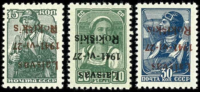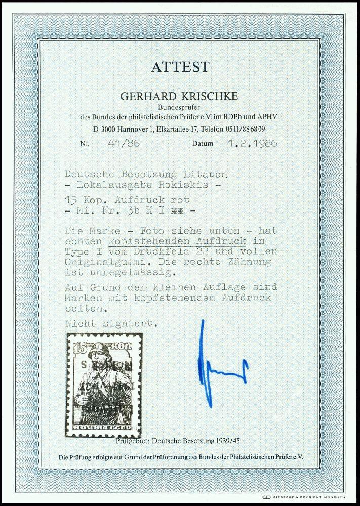 | Zusatzinformationen und Suchstichworte: | Dr. Reinhard Fischer 187. Auktion Auktionstermin: 15. Juli 2022 Los 4823 Deutsche Besetzung II. WK Litauen Rokiskis 15 Kop., 20 Kop. und 30 Kop Freimarke je mit Aufdruck, bei 15 Kop. und 30 Kop. rot, 20 Kop. schwarz, Abart "kopfstehender Aufdruck, 15 Kop. unruhige Zähnung, 20 Kop. Glanzstellen im Gummi, 30 Kop. tadellos, gepr. Krischke BPP mit Attest für 15 Kop., Mi. 750.- Ausruf 180,00 EUR |