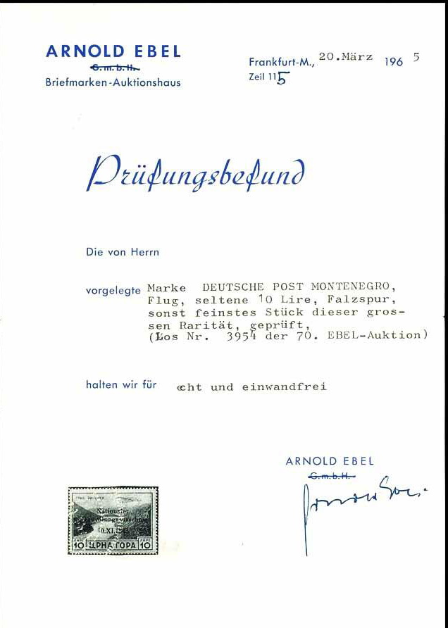 | Zusatzinformationen und Suchstichworte: | Dr. Reinhard Fischer 187. Auktion Auktionstermin: 15. Juli 2022 Los 4839 Deutsche Besetzung II. WK Montenegro 10 Lire Verwaltungsausschuss mit Aufdruck von Feld 32 der Überdruckplatte, ungebraucht mit Originalgummierung und Falzspur, Auflage nur 1.000 Exemplare, gepr. Dr. Oertel, Attest Ebel und Expertise Brunel VP (2022): "Die Erhaltung ist einwandfrei.", Mi. 4.000.- Ausruf 1.500,00 EUR |