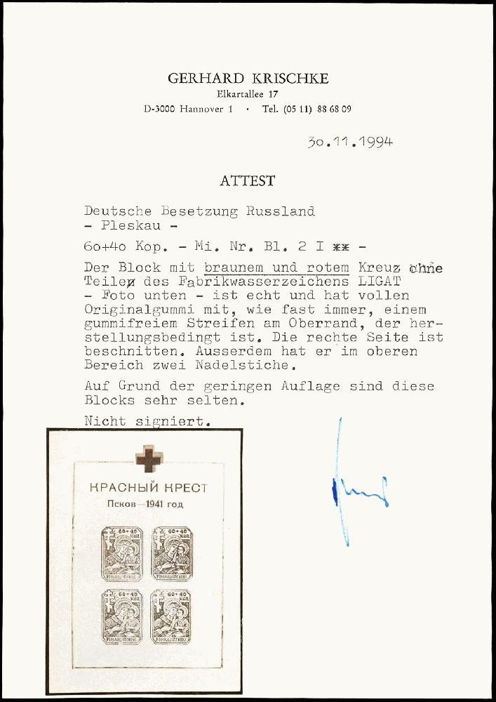 | Zusatzinformationen und Suchstichworte: | Dr. Reinhard Fischer 187. Auktion Auktionstermin: 15. Juli 2022 Los 4854 Deutsche Besetzung II. WK Russland - Pleskau Blockausgabe "Deutsches Rotes Kreuz" ohne Fabrikwasserzeichen mit zusätzlichem rotem Kreuz über dem braunen Kreuz in Blockrand, postfrisch, am Oberrand herstellungsbedingter gummifreier Streifen (kein Mangel), rechtsseitig beschnitten und im oberen Bereich zwei Nadelstiche - ansonsten tadellose Erhaltung, geringe Auflage - sehr selten, Attest. Krischke: "Aufgrund der geringen Auflage sind diese Blocks sehr selten." Mi. 13.000.- - kaum angebotene Rarität der Ausgaben Deutsche Besetzung II. Weltkrieg! Ausruf 2.000,00 EUR |