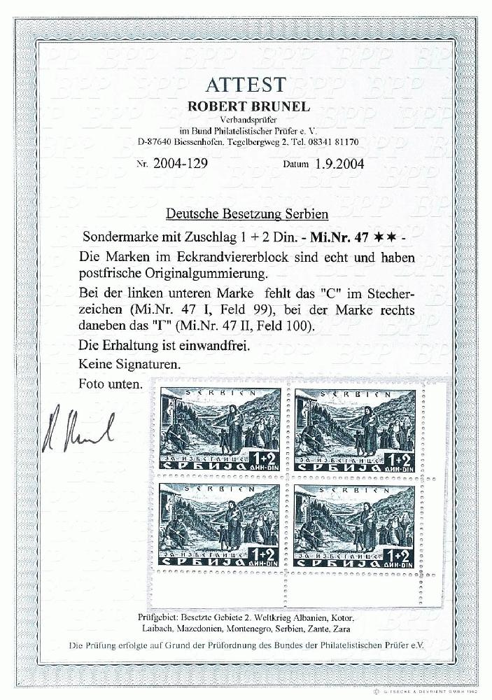 | Zusatzinformationen und Suchstichworte: | Dr. Reinhard Fischer 187. Auktion Auktionstermin: 15. Juli 2022 Los 4897 Deutsche Besetzung II. WK Serbien Wohltätigkeitsmarken über 1 + 2 Din. als Eckrandviererblock in postfrischer Erhaltung mit den Marken "fehlendes S. im kyrillischem Stecherzeichen S.G." auf Feld 99 und "fehlendes G. im kyrillischem Stecherzeichen S.G." auf Feld 100, Attest Brunel "Die Erhaltung ist einwandfrei." Mi. 1.000.- Ausruf 200,00 EUR |