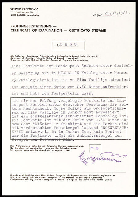 | Zusatzinformationen und Suchstichworte: | Dr. Reinhard Fischer 187. Auktion Auktionstermin: 15. Juli 2022 Los 4919 Deutsche Besetzung II. WK Serbien 1,50 Din. Ganzsachenkarte mit Zusatzfrankatur 0,50 Din. (über den Rand geklebt - daher etwas gestaucht) mit seltenem deutschen DKr. "BETSCHKEREK 1 / 22.VII.44" sowie Zensurstempel 001 / V. B. der Zensurstelle Grossbetschkerek nach Jankov Most mit Ank.-Stempel von Klek, gepr. Krischke BPP und gepr. mit Attest Ercegovic Ausruf 40,00 EUR |