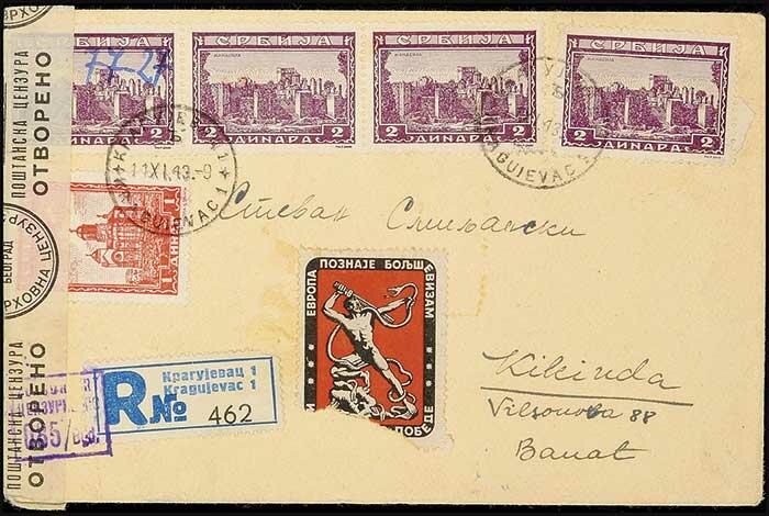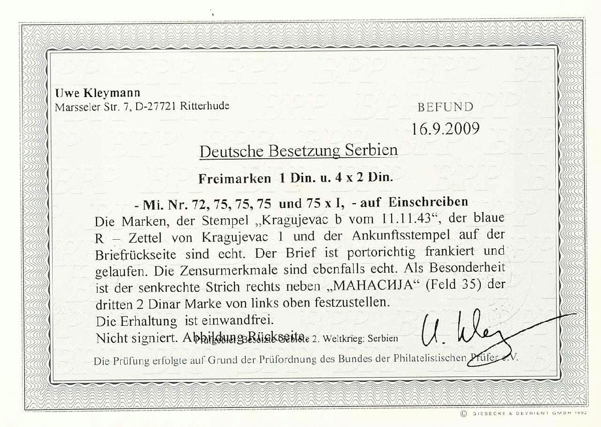 | Zusatzinformationen und Suchstichworte: | Dr. Reinhard Fischer 187. Auktion Auktionstermin: 15. Juli 2022 Los 4928 Deutsche Besetzung II. WK Serbien Mischfrankatur aus 1 Din. mit 2 Din.(4) auf portogerechtem Inlands-R-Brief nach Kikinda im Banat mit Aufgabe-Stpl. KRAGUJEVAC 1/B vom 11.11.43 sowie mit Zensurverschluss mit Zensur-Stpl. 085/Bgd. der Zensurstelle Belgrad und Propagandaklebezettel "Evropa poznaje boljsevizam i bori se do pobede"(Europa kennt den Bolschewismus und kämpft bis zum Sieg) und mit rückseitigem Ankunft-Stpl. KIKINDA vom 14.11.43; auf dem gut erhaltenen Umschlag hat die dritte 2 Din. Marke von links den Plattenfehler senkrechter Strich rechts neben "MAHACIJA", Befund Kleymann Ausruf 60,00 EUR |
