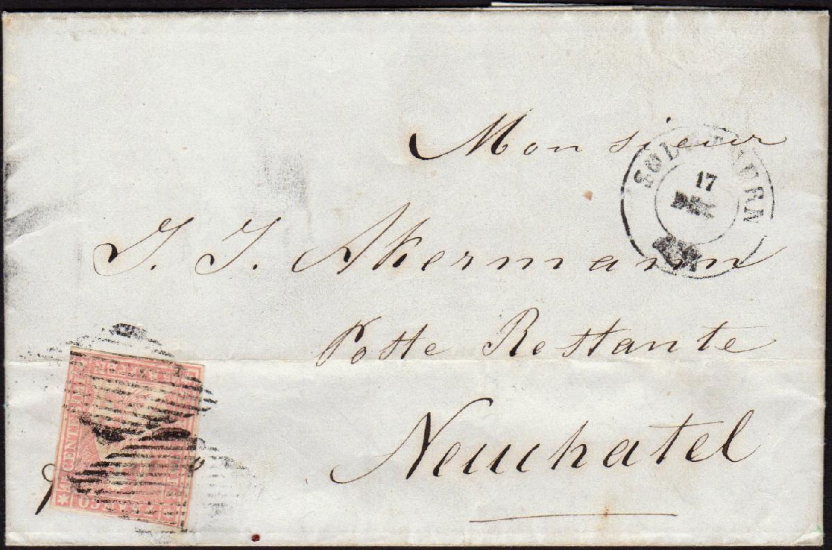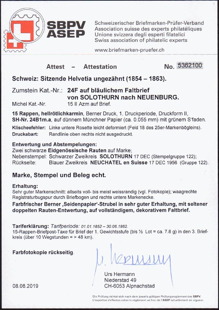 | Zusatzinformationen und Suchstichworte: | 108. Briefmarken Lenz Auktion Auktionstermin: 29. April - 5. Mai 2022 Los 2137 Schweiz 1854, 15 Rp. hellrötlichkarmin, 1. Berner Druck (SH-Nr. 24B1m.a), auf Faltbrief von SOLOTHURN nach NEUENBURG. Sehr guter Markenschnitt: allseits voll- weissrandig, waagr. Registraturbugspur durch Briefbogen und untere Makenecke. Entwertung Marke mit schwarze Eidgen. Raute, Nebenstpl. schwarzer Zweikreis "SOLOTHURN 17 DEC" und rückseitig blauer Zweikreis "NEUCHATEL en Suisse 17 DEC 1856". Farbfrischer Seidenstrubel in sehr guter Erhaltung mit seltener doppelten Rauten-Entwertung auf dekoratiem Brief, siehe Attest Hermann 2019 Ausruf 100,00 EUR |