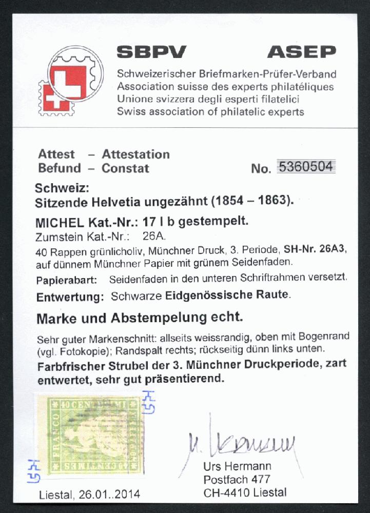 | Zusatzinformationen und Suchstichworte: | 108. Briefmarken Lenz Auktion Auktionstermin: 29. April - 5. Mai 2022 Los 2156 Schweiz 1854, 40 Rp. grünlicholiv, der 3. Druckperiode (SH-Nr. 26A3), allseits weissrdg., oben mit Bogenrand, Randspalt rechts, rückseitig dünn links unten, sauber gest. schwarze Eidgen. Raute, farbfrisch, siehe Attest/Befund Hermann 2014 Ausruf 60,00 EUR |