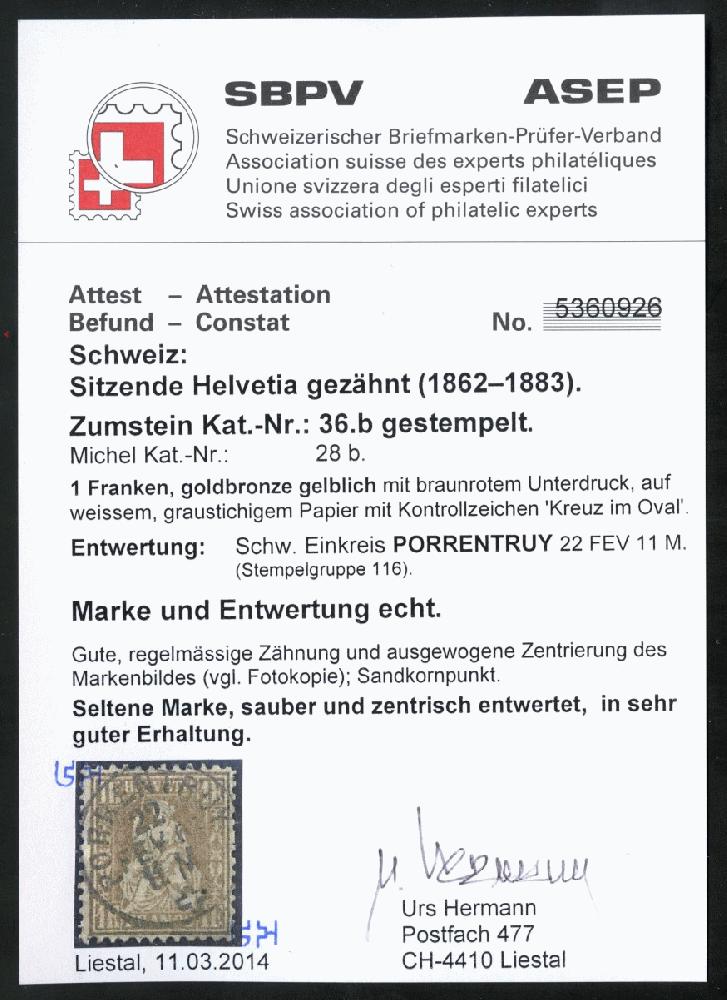 | Zusatzinformationen und Suchstichworte: | 108. Briefmarken Lenz Auktion Auktionstermin: 29. April - 5. Mai 2022 Los 2201 Schweiz 1863, 1 Fr. goldbronze gelblich, braunroter Unterdruck, gute Zähnung, sauber und zentr. gest., Sandkornpunkt, seltene Marke in sehr guter Erhaltung, Attest/Befund Hermann 2014 Zuschlag 125,00 EUR |