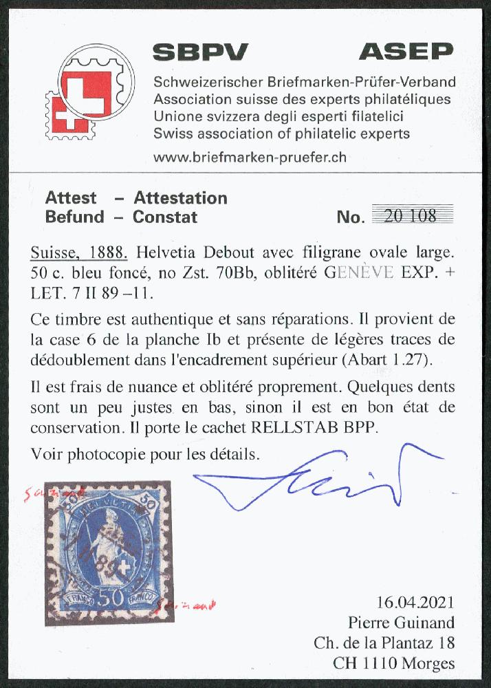 | Prüfer: | Guinand, Pierre (SBPV / ASEP (Schweizerischer Briefmarken-Prüfer-Verband)) |
