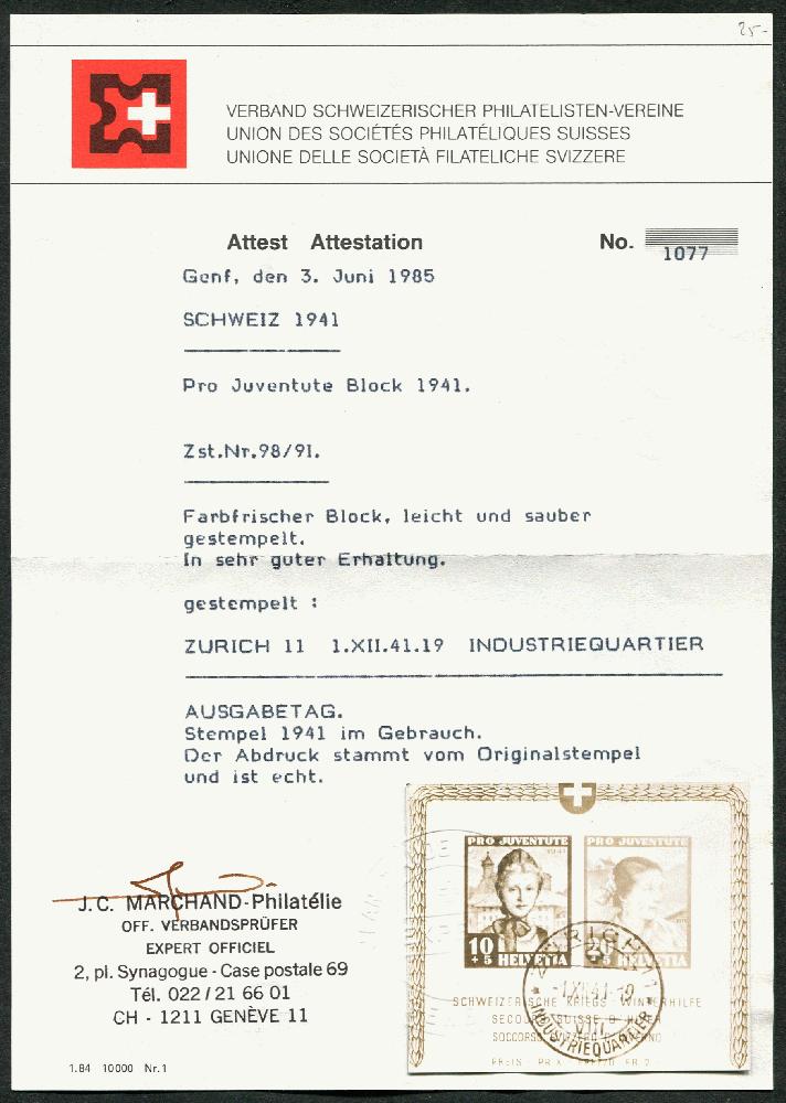 | Zusatzinformationen und Suchstichworte: | 108. Briefmarken Lenz Auktion Auktionstermin: 29. April - 5. Mai 2022 Los 2474 Schweiz 1941, PJ-Bl. mit Ersttags-Stpl. "Zürich-1.XII.41", Attest Marchand Zuschlag 63,00 EUR |