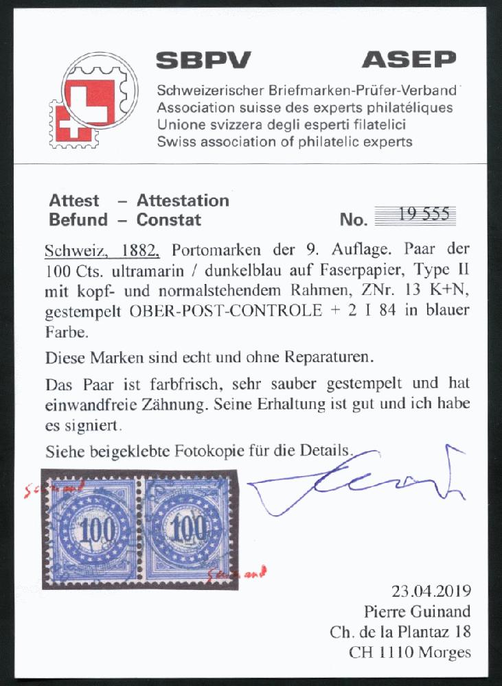 | Zusatzinformationen und Suchstichworte: | 108. Briefmarken Lenz Auktion Auktionstermin: 29. April - 5. Mai 2022 Los 2620 Schweiz 1882, 100 C. im waagerechem Paar, gest. "OBER-POST-CONTROLE-2.I.84", blau, Attest Guinand, SBK Fr.1'500,- Ausruf 250,00 EUR |