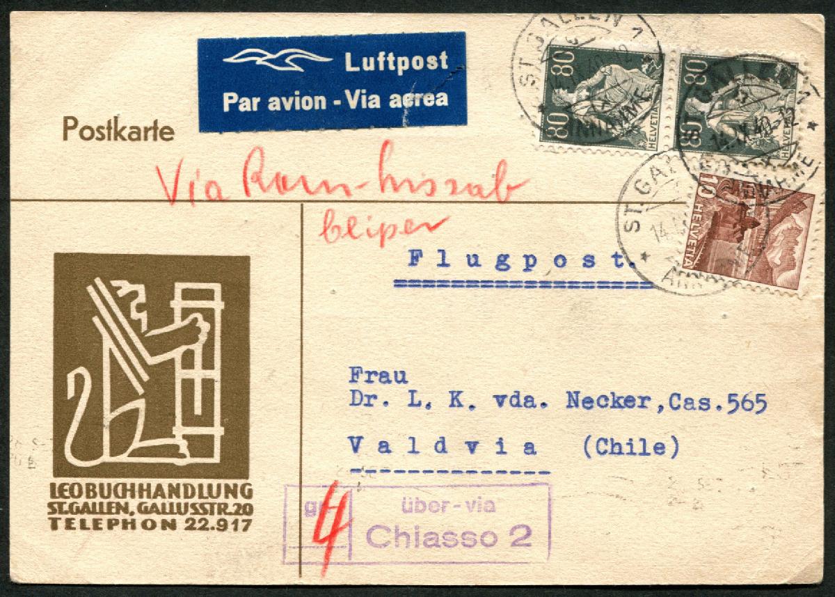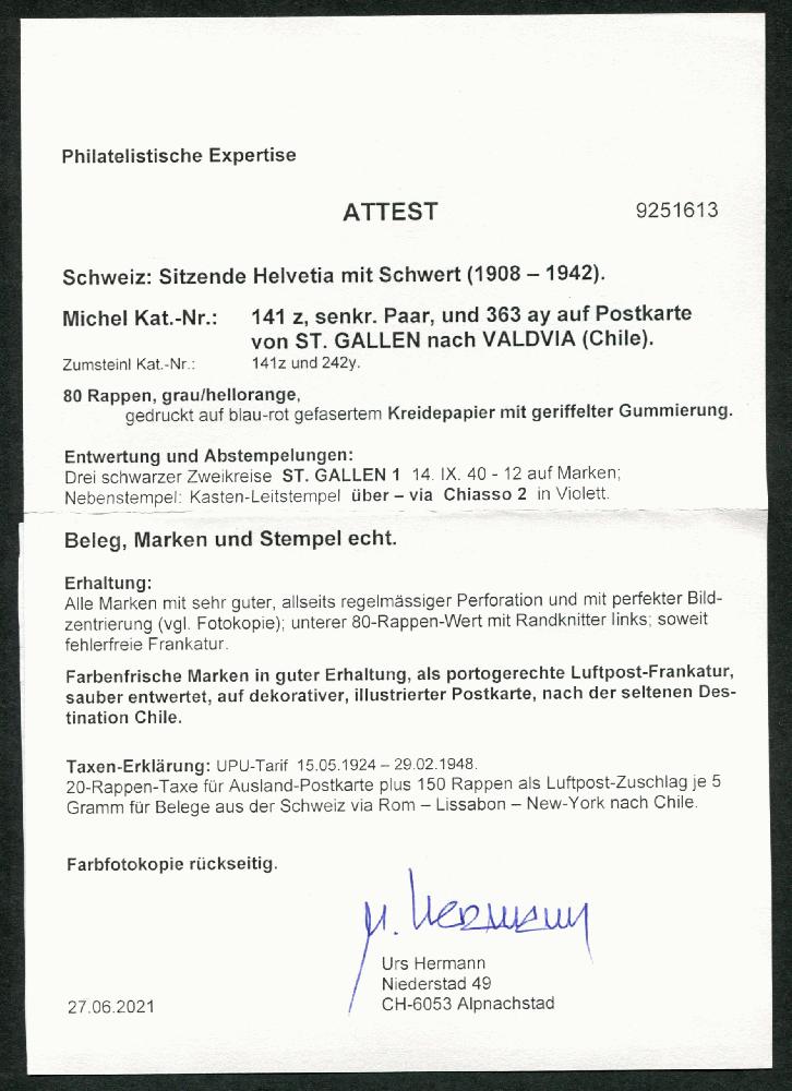 | Zusatzinformationen und Suchstichworte: | 108. Briefmarken Lenz Auktion Auktionstermin: 29. April - 5. Mai 2022 Los 2757 Schweiz 1940, Luftpost-Karte von "St.Gallen-14.IV.40" über Chiasso 2 nach Valdvia/Chile, Attest Hermann Zuschlag 30,00 EUR |