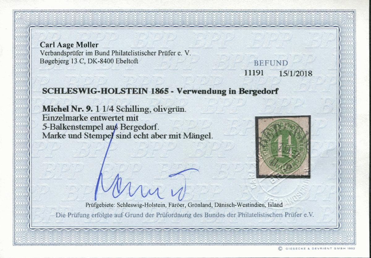 | Zusatzinformationen und Suchstichworte: | 108. Briefmarken Lenz Auktion Auktionstermin: 29. April - 5. Mai 2022 Los 5005 Altdeutschland Schleswig Holstein 1865, 1 1/4 S. grün, zentrischer, sehr klarer Bogen-Stpl. "BERGEDORF-19.7.", teils Scherentrennung, rs. winzig repariert, Attest Lasse Nielson und Befund Moller, selten so klar und zentrisch gestempelt, Mi.Stpl.850,- Ausruf 100,00 EUR |