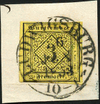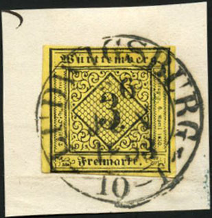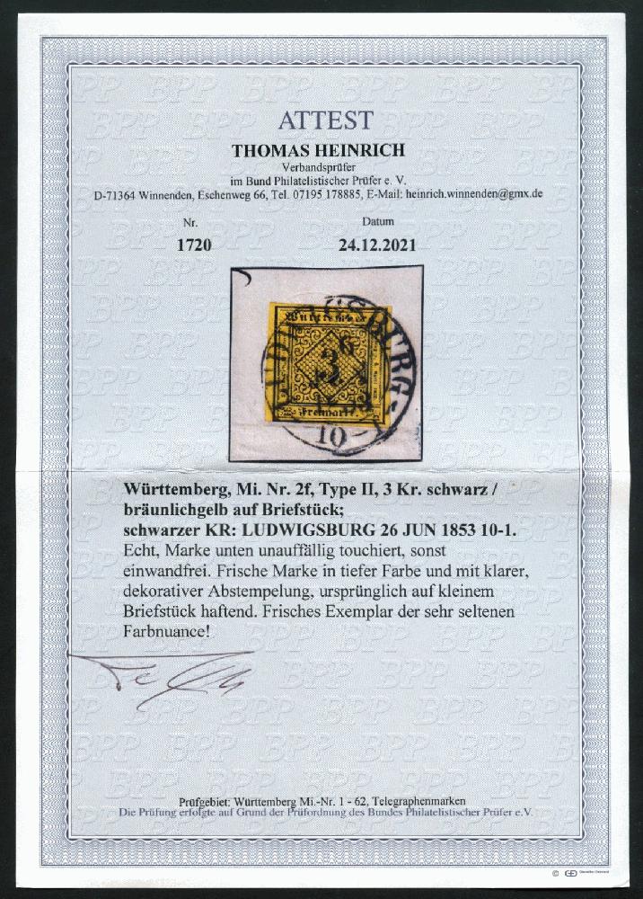 | Zusatzinformationen und Suchstichworte: | 108. Briefmarken Lenz Auktion Auktionstermin: 29. April - 5. Mai 2022 Los 5711 Altdeutschland Württemberg 1851, 3 Kr. auf bräunlichgelb, sehr seltene Nuance, Type 2, Marke unten links winzig berührt - sonst breitrandig, zentrisch klarer, großer K2 "LUDWIGSBURG-26.JAN.1853", weißes Bfst., lt. Attest Heinrich BPP "Frische Marke in tiefer Farbe", Mi.1'500,- Zuschlag 320,00 EUR |