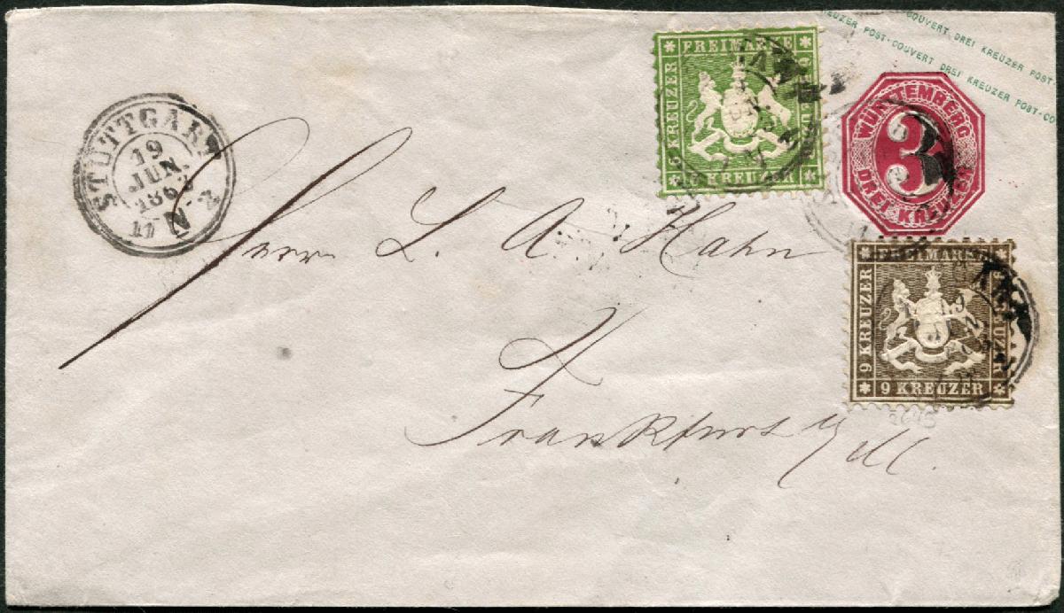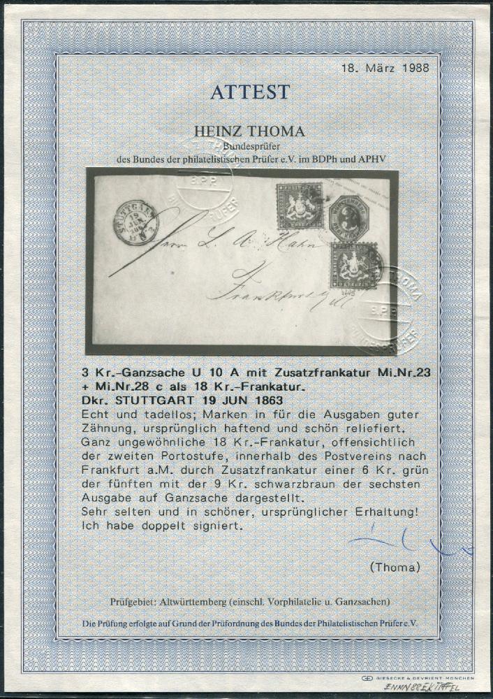 | Zusatzinformationen und Suchstichworte: | 108. Briefmarken Lenz Auktion Auktionstermin: 29. April - 5. Mai 2022 Los 5885 Altdeutschland Württemberg 1862/63, 1, und 6 Kr. Freimarke, auf 3 Kr. Ganzsachenumschlag, ganz ungewöhnliche 18 Kr. Frankatur aus "Stuttgart 19 JUN 1863" nach Frankfurt, sehr selten und schöner Erhaltung, Attest Thoma(1988) Zuschlag 3.200,00 EUR |