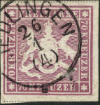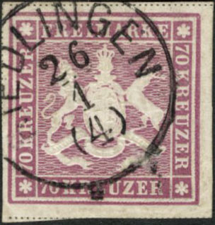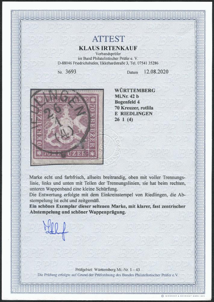 | Zusatzinformationen und Suchstichworte: | 108. Briefmarken Lenz Auktion Auktionstermin: 29. April - 5. Mai 2022 Los 5999 Altdeutschland Württemberg 1873, 70 Kr. rotlila, sehr farbfrisch, allseits breitrandig, oben mit voller Trennungslinie, links und unten mit teilen Trennunglinien, sehr klar fast zentr. Einkreisstpl. "Riedlingen 26 1 (4)", kl. Schürfung am rechten unteren Wappenband, neues Attest Irtenkauf 8/2020 "Ein schönes Exemplar dieser seltenen Marke, mit klarer, fast zentrischer Abstempelung und schöner Wappenprägung", Mi.5000,- Ausruf 1.000,00 EUR |